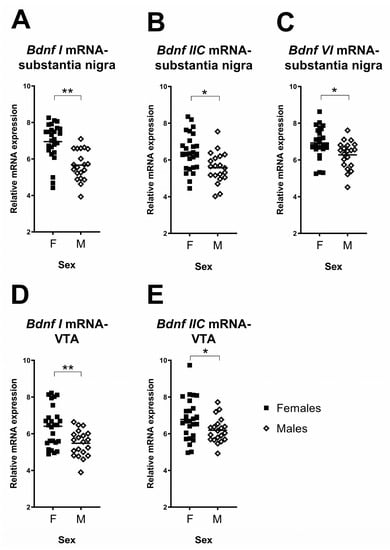 Differences between females and males in Bdnf transcript levels. (A–C) Females had significantly higher levels of Bdnf I, IIC and VI in the substantia nigra than males; (D,E) females had significantly higher levels of Bdnf I and IIC in the VTA than males. Each data point represents a single animal. Filled squares and hollow diamonds represent female and male animals, respectively. Horizontal lines depict group means. * p < 0.05, ** p < 0.005.