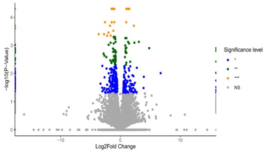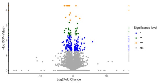 Volcano plot presenting all the differentially expressed genes (DEGs) upon the treatment of BPA 10 nM. Significance level for these gene was set as (blue dots * p-value < 0.05, green dots ** p-value < 0.005, orange dots *** p-value < 0.0005, and grey dots for no significant change (NS).