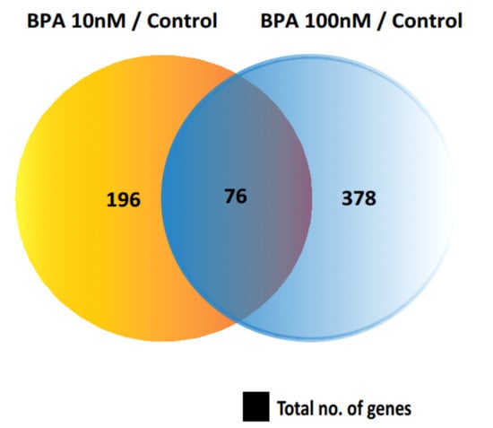 In total, 272 DEGs were identified in 10 nM BPA-treated HOSEpiC samples and 454 DEGs in the 100 nM BPA-treated ones compared to the control group. Among the DEGs identified in both groups, 76 genes were found to be commonly dysregulated irrespective of the level of BPA exposure (Figure 3).