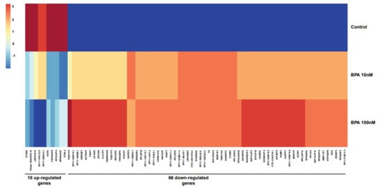 Heatmap reproduced expression profile for genes differently regulated (p < 0.05) over two used BPA doses (10 nM and 100 nM) and control group. Dark blue indicates low expression, and deep red indicates high expression.