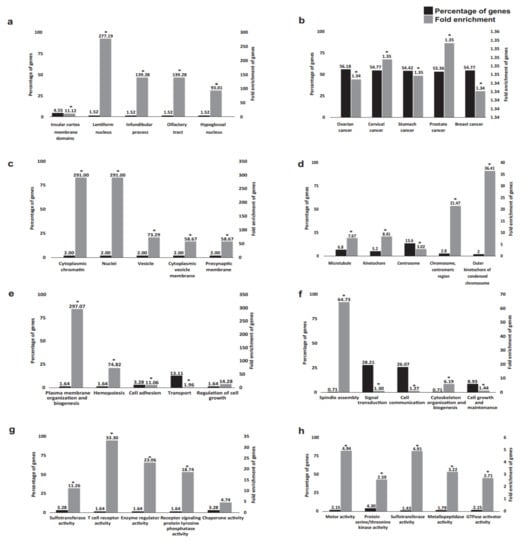 The functional enrichment in Gene Ontology terms in BPA 10 nM exposure DEGs (a,c,e,g) and BPA 100 nM exposure DEGs (b,d,f,h) in relation to site of expression (a,b), cellular components (c,d), biological processes (e,f), and molecular functions (g,h). * p < 0.05.