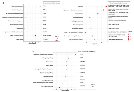 The results show that BPA exposure has a considerable impact on 10 genes: ANAPC2, AURKA, CDK1, CCNA2, CCNB1, PLK1, BUB1, KIF22, PDE3B, and CCNB3, which are also associated with progesterone-mediated oocyte maturation pathways. Studies have suggested that exposure to BPA may cause an increase in meiotic disturbances in mice, such as aneuploidy in oocytes [,]. It is well documented that exposure to BPA in the prenatal period is associated with cystic endometrial hyperplasia, ovarian cysts, aneuploidy in oocytes, and a reduction in the primordial pool of follicles in mouse ovaries, indicating an association between BPA and the increased proliferation of ovarian cells mediated by estrogenic pathway [,,].