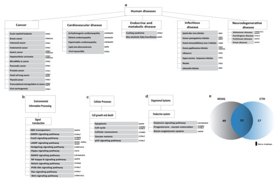Biological pathways associated with BPA-dysregulated genes in humans. (a) Human-disease-associated pathways. (b) Environmental information processing pathways. (c) Cellular-processes-associated pathways. (d) Endocrine-system-associated pathways. (e) Venn diagram presenting the common pathways in KEGG- and BPA-impacted pathways reported in CTD. Genes that affect each pathway are shown on the right corner of each block.