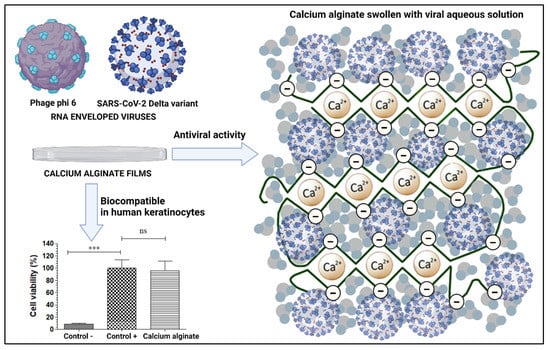 - Cano-Vicent, A.; Hashimoto, R.; Takayama, K.; Serrano-Aroca, Á. Biocompatible Films of Calcium Alginate Inactivate Enveloped Viruses such as SARS-CoV-2. Polymers 2022, 14, 1483. [Google Scholar] [CrossRef]