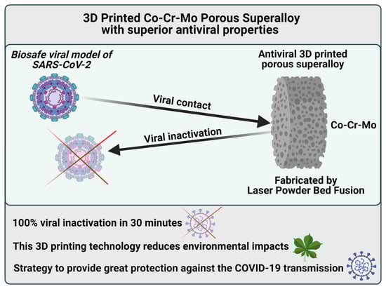 - Arjunan, A.; Robinson, J.; Baroutaji, A.; Tuñón-Molina, A.; Martí, M.; Serrano-Aroca, Á. 3D printed cobalt-chromium-molybdenum porous superalloy with superior antiviral activity. Int. J. Mol. Sci. 2021, 22, 12721. [Google Scholar] [CrossRef] [PubMed]