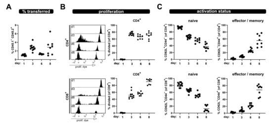 Kinetic of allogenic T cell activation in blood sample. Transferred T cells were analyzed from the blood at day 1, 3, 6 and 8 after transfer for (A) their frequency among lymphocytes, (B) proliferation of CD4+ and CD8+ T cells as well as (C) naive and effector/memory status—analogous to what is shown in Figure 1. Data are represented as individual values plus mean. Representative FACS histograms of individual mice are shown.