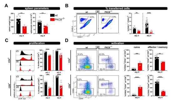 Next, we aimed to test whether the relevance of “genes of interest” for allogenic T cell activation in vivo can be determined by applying the modified P → F1 model. Therefore, T cells from protein kinase C-theta (PKCθ)-deficient mice, a knockout-mouse strain known to have an impaired T cell response, were used. Others, as well as our laboratory, have already demonstrated that PKCθ is activated downstream of the TCR complex and is involved in early T cell activation [11,15]. Thus, the knockout of PKCθ results in a hypo-responsive T cell phenotype with reduced proliferation and IL-2 production [11,15]. As expected, allogenic recipients of PKCθ-deficient T cells demonstrated significantly reduced spleen weight and splenocyte counts compared to recipients of wild type T cells (Figure 3A). Of note, spleen parameters were (almost) comparable to what was observed with syngenic recipients of wild type T cells (Figure 1B). Accordingly, the percentage of transferred PKCθ-deficient T cells was lower than transferred wild type T cells and remained at levels comparable to the percentage of wild type T cells in syngenic recipients (Figure 1C and Figure 3B). The difference between T cells of both genotypes was especially pronounced at day 8, in agreement to what we expected for hypo-responsive T cells. Moreover, significant proliferation deficiency (Figure 3C) and impaired transition from naive to effector/memory T cells (Figure 3D) was observed with PKCθ-deficient CD4+ as well as CD8+ T cells.