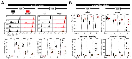 Using this approach, we observed enlarged spleens as well as increased splenocyte counts on day 3 and 8 after ACT, accompanied by the massive proliferation of CD4+ as well as CD8+ T cells in allogenic but not syngenic recipients. In this regard, the flow cytometric analysis revealed that the donor T cell phenotype changes from a dominantly naive to an exclusively effector/memory state and acquires exhausted profiles on day 8 after ACT. This can also be observed in a blood kinetic over time (d1, d3, d6, d8) with the accumulation of proliferated cells and a switch from a naive to an effector phenotype. However, this was all impaired in the case of PKCθ-deficient donor T cells, supporting our attempt to use this model in the future to determine genes that might be positive regulators of T cell functions. Our results, demonstrating reduced allogenic proliferation of T cells lacking PKCθ, are in line with what is known from the literature implicating a role of PKCθ in alloreactivity and GVHD. Thus, PKCθ-deficient donor T cells demonstrated reduced ability to induce disease in MHC-mismatched hosts (using TCD-BMT GVHD models [29,30], fitting to impaired in vivo proliferation in allogenic settings at day 3 or 4 after ACT [29,31]. Additionally, inhibitors for PKCθ, but also targeting PKCα, could prevent GVHD [30].