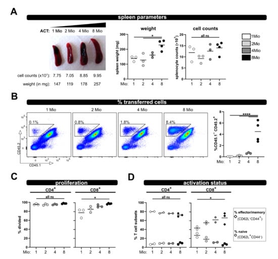 Titration of transferred T cell numbers. (A) Representative pictures of spleens on day 8 after transfer of 1, 2, 4 or 8 million wild type T cells are depicted. (B) Frequency of the transferred T cells among splenocytes and from blood at day 8 after ACT was determined by flow cytometry. (C) Proliferation and (D) T cell activation status (naive and effector/memory) of transferred wild type CD4+ and CD8+ T cells was analyzed at day 8 by CD62L and CD44 staining and flow cytometry. Data are represented as individual values plus mean. Representative FACS dot plots of individual mice are shown. ns = not significant, * p < 0.05, **** p < 0.0001; one-way ANOVA following Bonferroni’s post hoc test.