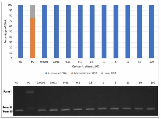 The effects of skyrin on plasmid DNA were investigated by DNA-topology assay. Firstly, we determined the potential of skyrin to form single- and double-strand breaks in plasmid DNA. None of the tested concentrations of skyrin (0.0001–100 μM) exhibited DNA-damaging properties, similarly to the negative control (Figure 1). The potential DNA-protective capacity against Fe2+-induced DNA breaks was also evaluated. The ability of skyrin to protect plasmid DNA increased in a concentration-dependent manner (Figure 2), and strong DNA protectivity was observed in samples with higher concentrations of skyrin (5–100 μM).