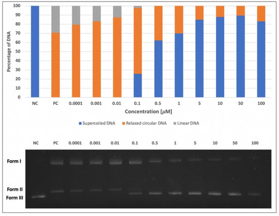 DNA-protective activity of skyrin (SK) analyzed by DNA-topology assay. Electrophoretic monitoring of changes induced by FeSO4 × 7H2O in the topology of plasmid DNA (pBR322) after skyrin application (Form I = relaxed circular DNA; Form II = linear DNA; Form III = supercoiled DNA). Legend: Line 1: pBR322 (negative control-NC); line 2: pBR322 + FeSO4 × 7H2O (positive control-PC); lines 3–12: pBR322 + FeSO4 × 7H2O + different concentrations of skyrin. Experiments were performed three times with similar results, and the representative electrophoretic gel is presented. The bar chart shows the percentage of individual topological forms of plasmid DNA in corresponding lines.