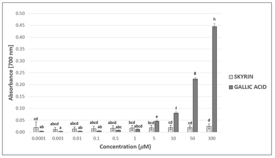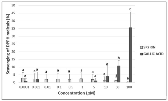 DPPH• radical scavenging activity of skyrin (light grey columns) in comparison with gallic acid used as a positive control at the same concentrations (dark grey columns). Each value is expressed as mean ± standard deviation. Results were analyzed by ANOVA single-step multiple comparisons of means using LSD tests, and comparisons between the mean values were considered significant at p < 0.05. Similar letters represent samples with no statistically significant differences between them. All experimental data in this work are from at least three independent experiments.