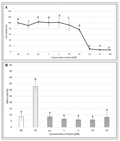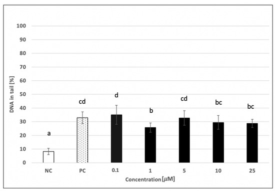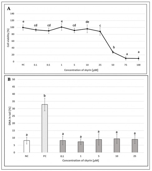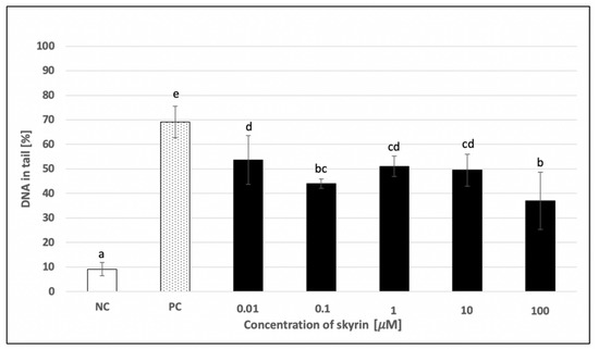 Evaluation of the potential DNA-protective effects of skyrin (SK) on human lymphocytes (1 h treatment) at different concentrations, using the comet assay. Negative control (NC)—untreated cells; positive control for comet assay (PC)—cells treated with 440 μM hydrogen peroxide. Tested samples were treated with a different concentration of skyrin (1 h treatment), and hydrogen peroxide (440 μM) was subsequently added (5 min treatment). Results were analyzed by ANOVA single-step multiple comparisons of means using LSD tests, and comparisons between the mean values were considered significant at p < 0.05. Similar letters represent samples with no statistically significant differences between them. All experimental data in this work are from at least three independent experiments.