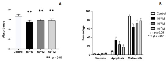 Cultured human osteoblast cells treated with 10−5, 10−6, or 10−7 M for 24 h and untreated control cells were detached from the culture flask, washed, suspended in 300 µL PBS, and then labeled with annexin V and PI (Immunostep S.L., Salamanca, Spain), incubating 100 µL aliquots of the cell suspension with 5 µL annexin V and 5 µL PI for 15 min at room temperature in the dark. Cells were then washed, suspended in 500 µL PBS, and immediately analyzed in a flow cytometer with argon laser (Facs Vantage Becton Dickinson, Palo Alto, Santa Clara, CA, USA) at a wavelength of 488 nm to determine the percentage of fluorescent cells. We calculated the percentage of annexin-positive (apoptotic) cells and PI-positive (necrotic) cells from counts of 2000–3000 cells [40].