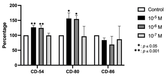 Expression of CD54, CD80, and CD86 in cells treated for 24 h with BPA (10−5, 10−6, or 10−7 M). Data are expressed as percentage expression with respect to control ± standard deviation. Significant differences * p < 0.05; ** p < 0.001.