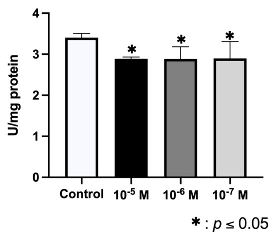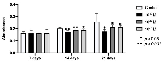 Data depicted in Figure 3 show that the ALP activity of osteoblasts was significantly reduced after 24 h of treatment with BPA at all doses (10−5, 10−6, and 10−7 M), obtaining the greatest effect at the highest dose.