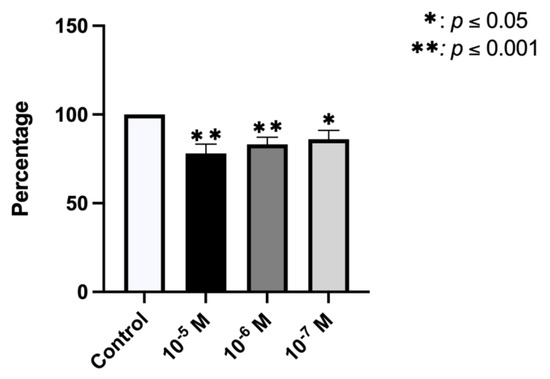 SPSS version 24.0 (IBM SPSS, Armonk, NY, USA) was used for the statistical analysis. Each experiment was performed in triplicate for each culture. Results were expressed as means ± SD, and the Kolmogorov–Smirnov test was applied to evaluate the normality of variable distributions. One-way analysis of variance (ANOVA) was performed, applying the Bonferroni correction. p < 0.05 was considered significant. All data were analyzed in relation to the control group.