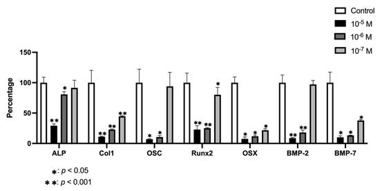 Expression of osteoblast genes (ALP, COL-1, OSC, RUNX2, OSX, BMP-2, and BMP-7) treated for 24 h with BPA at doses of 10−5, 10−6, or 10−7 M. The data are expressed as the mean of expression percentage with respect to control group ± standard deviation. * Significant differences p < 0.05, ** p < 0.001.