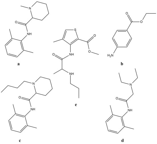 Chemical structures of the most common local anesthetics: mepivacaine (a), benzocaine (b), bupivacaine (c), lidocaine (d) and articaine (e).