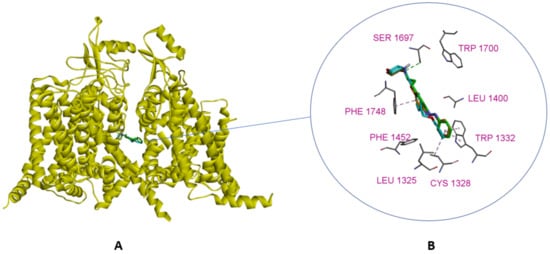 Molecular docking calculations were performed to evaluate the possibility of ethercaine binding to the voltage-gated sodium channels. Local anesthetics bind in the inner part of the pore region of Nav channels, which is known to have a high degree of sequence identity among all known Nav isoforms. Nav1.7 isoform is a genetically validated target for pain treatment [], so the structure of this isoform (PDB ID: 6J8H, []) was used to further calculations (Figure 4).