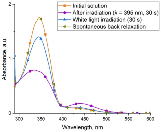 The photoswitching properties of the micellar solution of compound 6 were studied using UV/Vis spectrophotometry. Despite the successful use of UV light in a number of medical procedures [], exposure to UV-A and UV-B light is still potentially harmful to humans. In order to diminish the possible negative impact of UV radiation on the body in biological studies, a light source with a wavelength of λ = 395 nm, which is at the edge of the visible range, was used. When the cell with a solution is irradiated, a transition to another photostationary state with the predominance of the Z-isomer in the solution occurs, as it follows from the changes in the electronic absorption spectrum characteristic of this class of compounds (Figure 5) [,,]. The solution was irradiated stepwise with increasing exposure time, and it was determined that the time sufficient for the equilibrium with the predominance of Z-form is 30 s.