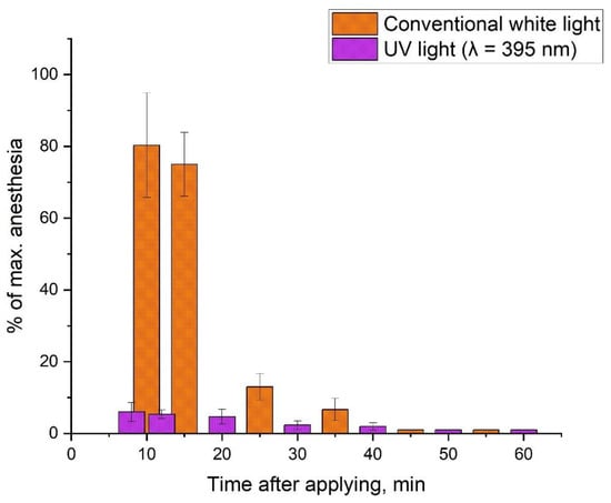 As expected, the local anesthetic activity of 2% lidocaine solution selected as a control anesthetic manifests no statistically significant differences with and without irradiation. A 4% micellar solution of Kolliphor ® ELP used as a negative control had a minimum Regnier index, which indicated that local anesthesia was completely absent.