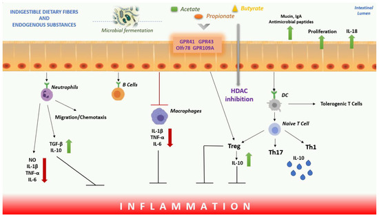 Overview of the effect of the SCFAs on inflammation. In the intestinal lumen, SCFAs induce the secretion of IL-18, MUC2 and antimicrobial peptides from intestinal epithelial cells, induce IgA secretion from B lymphocytes and regulate tight junction expression. SCFAs bind to GPR41, GPR43, GPR109A receptors and activate Olfr78 receptor signalling to regulate T cell function increasing the generation of Th1 and Th17 cells and promoting the production of T cells that release IL-10 and T regs. SCFAs act on DCs to limit the expression of T cells activating molecules, resulting in the generation of tolerogenic T cells rather than inflammatory T-cells. SCFAs also reduce neutrophil recruitment, with increased levels of TGF-β, IL-10 and decreased levels of IL-6, IL-1β, NO, and TNF-α. Instead, through HDAC inhibition, they influence the inhibition of nuclear factor NF-κB, to inhibit inflammation. Abbreviations: DCs, Dendritic Cells; SCFAs, Short-chain Fatty Acids; GPCRs, G-Protein-coupled Receptors; HDAC, Histone Decetylase; NO, Nitric Oxide; TGF-β, Transforming Growth Factor beta; TNF-α, Tumor Necrosis Factor alpha; IL, Interleukin; Mucin, MUC2; NF-κB, Nuclear Factor Kappa-light-chain-enhancer of Activated B cells.