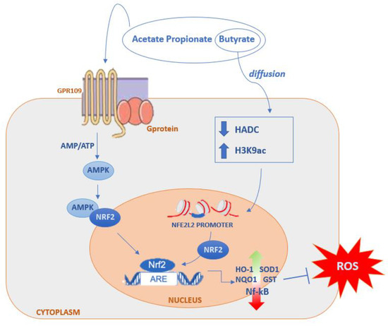 Furthermore, numerous studies have shown that SCFAs, particularly butyrate and propionate, were also able to modulate the Keap1-Nrf2-dependent cellular signalling pathway to maintain redox homeostasis through both direct and indirect mechanisms (Figure 2; [125,126,127,128,129,130]). Butyrate, through the recognition of the GPR109A receptor, induces the activation of the nuclear factor Nrf2, which encodes antioxidant enzymes for the inactivation of ROS [108]. Furthermore, butyrate has a synergistic action on the activation of Nrf2 because, by spreading in the cell lumen, it inactivates HDAC and consequently increases the production of histone H3K9ac thus inducing an epigenetic modification on the Nrf2 promoter, as demonstrated through various studies [125,126,131,132,133]. Acetate, propionate, and butyrate can synergistically activate the translocation of Nrf2 through the recognition of GPR41 and GPR43 receptors [134,135,136].