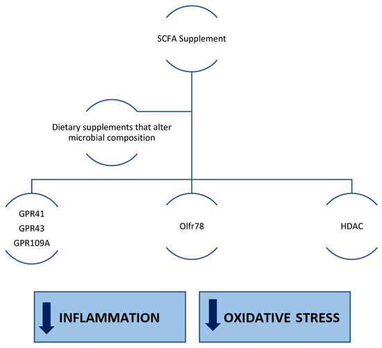 SCFAs produced by microbial fermentation have been widely shown to reduce inflammation and oxidative stress, which are characteristic of several chronic diseases. CKD is a serious health problem, not least because of the systemic complications associated with it, and it is also a chronic condition that is very difficult to manage because of the underlying disease mechanisms. Therefore, the supplementation of short-chain fatty acids (e.g., acetate, propionate, or butyrate), either directly or by modulating the gut microbiota in favour of SCFA-producing bacterial species, including through dietary fibre or nutritional therapies, could have a positive impact on the management of chronic renal failure (Figure 3). However, further studies are still needed.