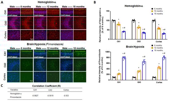Age-related decline of hemoglobin-α (Hb-α) with parallel increase in brain hypoxia in the intact male mouse brain. (A) Representative photomicrographs from male mouse hippocampal CA1, CA3 and cerebral cortex regions showing age-related decline in Hb-α staining and parallel increase in brain hypoxia as measured by pimonidazole (hypoxyprobe-1) staining. (B) Semi-quantitative intensity analysis of Hb-α and pimonidazole staining in hippocampal CA1 and CA3 regions and cerebral cortex of all male mice at different ages. (C) Correlation coefficient analysis between Hb-α and pimonidazole in hippocampal CA1, CA3 and cortex regions. *: p < 0.05 vs. 6 months; #: p < 0.05 vs. 12 months; n = 5. Scale bar: 20 μm.
