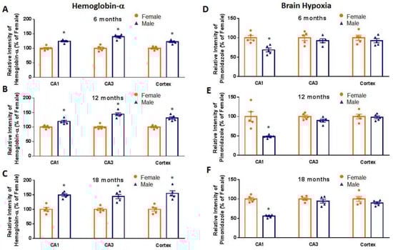 Gender differences in neuronal hemoglobin-α (Hb-α) levels and brain hypoxia in the mouse brain in aging. Semi-quantitative intensity analysis of Hb-α (A–C) and pimonidazole staining (D–F) in hippocampal CA1 and CA3 regions and cerebral cortex of all female and male mice at different ages. *: p < 0.05 vs. female; n = 5.