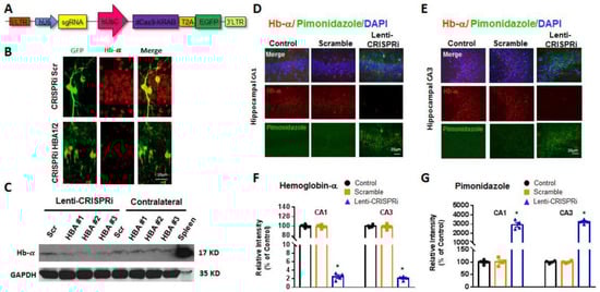 To help determine the roles and functions of neuronal Hb-α in the hippocampus, we established in vivo lentivirus CRISPR interference-based Hb-α knockdown (Hb-α CRISPRi KD). The CRISPR-Cas9 system has been widely used as a powerful tool for genome editing in cells and animal tissue, including post-mitotic brain neurons []. In the CRISPRi approach modified from the CRISPR-Cas9 system, an engineered nuclease null form Cas9 (dCas9) is fused to the transcription repressor KRAB (dCas9-KRAB). Navigated by a single guide RNA (sgRNA), dCas9-KRAB can recognize specific genomic loci of interest and block transcription around a window of the transcriptional start site (TSS), thereby providing effective knockdown of the target gene []. To establish the feasibility of this approach, we performed preliminary studies to use the plasmid constructs carrying the dCas9-KRAB modified from the lentiCRISPR v2 vector (Figure 4A). Three sgRNAs were designed to target the DNA region from −50 to 300 bp relative to the TSS of the Hb-α encoding gene HBA1/2. The effectiveness of the Hb-α CRISPRi KD was then examined in mouse HT-22 cells and cultured primary mouse hippocampal neurons. As shown in Figure 4, Hb-α CRISPRi KD was demonstrated to strongly inhibit the expression of Hb-α in mouse HT-22 cells (Figure 4B) and primary cultured mouse hippocampal neurons transfected with the sgRNA-dCas9-KRAB plasmid as indicated by GFP expression (Figure 4C).