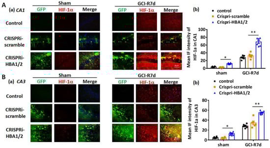 Effect of hemoglobin-α knockdown on HIF-1α expression in the male mouse hippocampal CA1 and CA3 regions following global cerebral ischemia (GCI). (A)/(a) and (B)/(a) Representative photomicrographs of HIF-1α immunostaining in 3-month-old male mouse hippocampal CA1 and CA3 regions from control (empty, upper row), scramble (lenti-CRISPRi-scramble, middle row) or Hb-α knockdown (lenti-CRISPRi-HBA1/2, lower row) groups. (A)/(b) and (B)/(b) Quantification of mean immunofluorescence (IF) demonstrates a mild increase in HIF-1α expression in sham after Hb-α knockdown (*: p < 0.05, n = 6). At 7 days after GCI reperfusion (R7d), Hb-α knockdown robustly increased HIF-1α expression in both hippocampal CA1 (A) and CA3 regions (B). (*: p < 0.05, **: p < 0.01, n = 6). Scale bar: 20 μm.