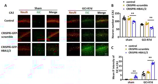 Since PUMA and NOXA are pro-apoptotic genes, their enhanced induction in neuronal Hb-α knockdown mice could suggest that Hb-α is neuroprotective, and its loss leads to increased neuronal cell damage and death basally and after ischemia. Therefore, we next examined the effect of neuronal Hb-α knockdown on neuronal survival and neurodegeneration in the hippocampus. To accomplish this, we used IHC for the neuron marker, NeuN, to measure neuron survival, and we used Fluoro Jade C (FJC) staining, a marker of neurodegeneration, to measure neurodegeneration in sham and GCI animals at 7 days post GCI (GCI-7d). Representative photomicrographs are shown in Figure 9A and Figure 10A, while NeuN-positive cell number and FJC intensity analysis in the hippocampal CA1 region for all animals are shown in Figure 9B,C and Figure 10B,C. The results revealed that Hb-α knockdown led to a mild but significant decrease in NeuN staining and NeuN-positive cell number, and a mild but significant increase in FJC staining in sham animals in both the hippocampal CA1 and CA3 regions, while the CRISPRi-scramble control had no effect (Figure 9 and Figure 10A–C). These results indicate that there is a mild decrease in neuronal survival and a mild increase in neurodegeneration after Hb-α knockdown in non-ischemic animals. Furthermore, similar to the PUMA and NOXA results, lenti-CRISPRi knockdown of Hb-α led to a robust decrease in neuronal survival (as evidenced by decreased NeuN staining and NeuN-positive cell number) and a robust increase in neurodegeneration (as evidenced by increased FJC staining) in the hippocampal CA1 and CA3 regions at 7 days after GCI, which was highly significant as compared to the GCI control and GCI + CRISPRi-scramble control (p < 0.01) (Figure 9 and Figure 10A–C). This finding suggests that neuronal Hb-α plays an important role in protecting neurons from ischemic/hypoxia-induced cell damage and death.