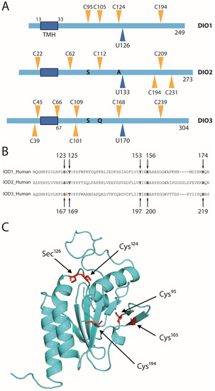 - Callebaut, I.; Curcio-Morelli, C.; Mornon, J.P.; Gereben, B.; Buettner, C.; Huang, S.; Castro, B.; Fonseca, T.L.; Harney, J.W.; Larsen, P.R.; et al. The iodothyronine selenodeiodinases are thioredoxin-fold family proteins containing a glycoside hydrolase clan GH-A-like structure. J. Biol. Chem. 2003, 278, 36887–36896. [Google Scholar] [CrossRef] [PubMed]