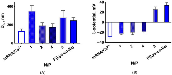 It should be noted that in all cases mRNA was initially condensed by addition of Ca2+ ions. By using calcium complexation, the particle size and mRNA complexation were significantly improved. Notable, that no harmful effects of such complexation on cellular calcium homeostasis [41] were observed due to the low concentration of calcium ions used. According to the first approach polyplexes were formed by simple addition of polycation to condensed mRNA. Addition of mRNA at optimized N/P ratios leads to formation of more compact particles (Figure 3A). However, the analysis of ζ-potentials for formed polyplexes revealed negative charge for the smaller nanoparticles (Figure 3B). This could be explained by attaching of mRNA/Ca2+ to the surface of P(Lys-co-Ile) particles, which are quite flexible, but compact and stabilized by hydrophobic interactions. Thus, mRNA molecules could not be considered as encapsulated into polyplexes, but simply spun on polycation particles surface. Such location of mRNA molecules could lead to their rapid destruction by enzymes [42,43]. It should be noted that simple mixing of mRNA and polypeptide resulted in two modes on the particles size distribution curve obtained by DLS (see Figure S3 in Supplementary Materials), which is also the negative side of this method of obtaining polyplexes.
