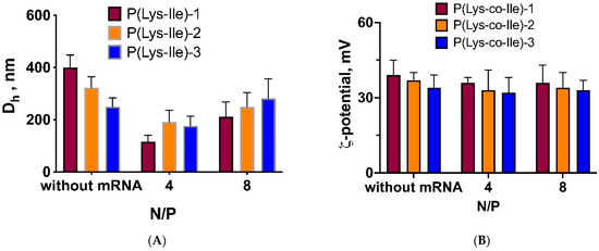 The effect of cationic polypeptide addition to mRNA/Ca2+ at different proportions on size (A) and ζ-potential (B) of formed polyplexes. The presented data were obtained for P(Lys-co-Ile)-3 copolymer. The measurements were performed in ultrapure H2O. Results are given as Mean ± SD (n = 3).