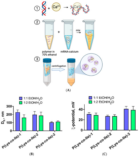 Encapsulation of mRNA into P(Lys-co-Ile) was possible by applying third approach, namely, phase inversion method. For that, polypeptides were dissolved in a 70% ethanol-water mixture at concentration of 1 mg/mL. The predetermined volume of polymer solution was mixed with mRNA/Ca2+ and incubated during 30 min. The final particles with encapsulated mRNA were formed during removal of ethanol, which was performed by sequential addition of 0.01 M phosphate buffer saline, pH 7.4 (PBS 7.4) and ultracentrifugation (Figure 5A).