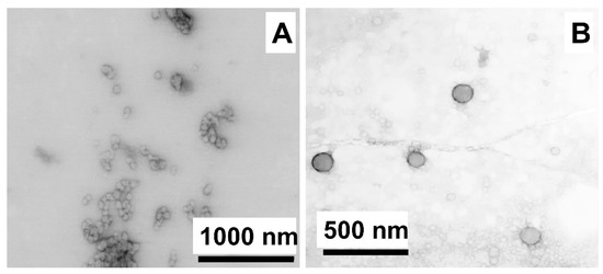TEM images of p(Lys-co-Ile)-3/Mrna-Ca2+ polyplexes obtained by: ultrasonication (A) and phase inversion method (B).