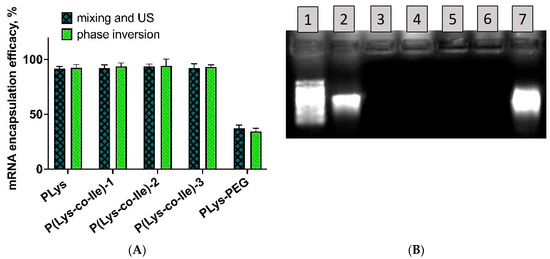 Encapsulation of mRNA into polypeptide-based polyplexes obtained via phase inversion was also assessed by electrophoresis in agarose gel. The results showed that the mobility of mRNA was completely retarded at chosen N/P, which proves the high efficiency of this nucleic acid binding within obtained polyplexes (Figure 7B).