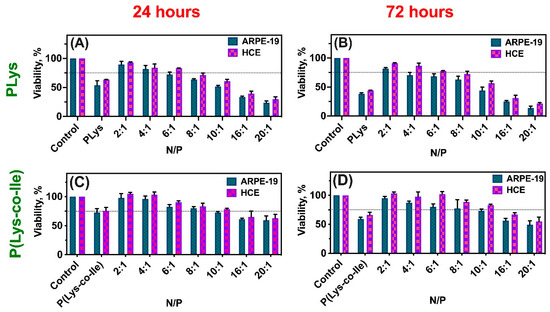 MTT test results: viability of human retinal pigment epithelial cells (ARPE-19) and human corneal epithelial cells (HCE) at different time points: (A) PLys and polyplexes after 24 h; (B) PLys and polyplexes after 48 h; (C) P(Lys-co-Ile)-3 and polyplexes after 24 h; (D) P(Lys-co-Ile)-3 and polyplexes after 48 h. Different N/P ratios were tested. Pure PBS, pH 7.4 served as control (100% of viability). Results are given as Mean ± SD (n = 3).
