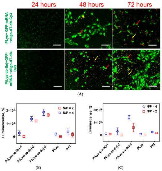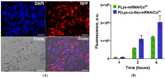 The ability of the polyplexes for effective intracellular penetration is an important prerequisite for their application as transfection agent. In contrast with transfection of cells with pDNA, which should be delivered into nucleus, mRNA effectively initiates the expression of desired protein after delivery to cytosol. Here we have tested the ability of polyplexes based on P(Lys-co-Ile) and EGFP-mRNA to penetrate the cytosol. In order to detect the intracellular penetration of polyplexes Cy3 labeled oligonucleotide duplex, namely oligo-dT-dA (Cy3-oligo-dT-dA), was included into composition of these polyplexes. The hydrodynamic diameter of P(Lys-co-Ile)/EGFP-mRNA/Cy3-oligo-dT-dA particles (162 ± 34 nm) was similar to those of just P(Lys-co-Ile)/EGFP-mRNA (155 ± 41 nm). Fluorescent labeling of oligonucleotide allowed us to detect its penetration to the ARPE-19 cells via fluorescent microscopy (Figure 10A). The presented images clearly show the concentration of the labeled oligonucleotide in the cytosol of the cells near the DAPI stained nucleus.