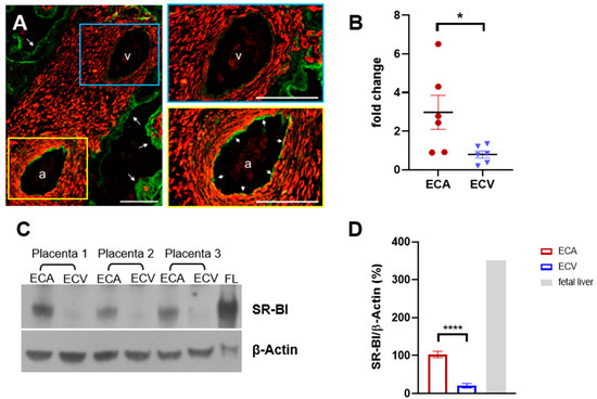 Figure 1. (A) Immune fluorescence staining against SR-BI in a term placental stem villus. SR-BI (green) was found on the syncytiotrophoblast (white arrows, overview picture) and on the endothelium of villous arteries (yellow framed detail picture) but not on the endothelium of villous veins (blue framed detail picture). Placental tissue was double-stained against Desmin (red) to visualize villous structures. Scale bars: 80 µm. (B) qRT-PCR demonstrated higher SR-BI mRNA expression in ECA compared to ECV (n = 6 each, mean ± SD, t-test). (C) Representative Western Blot of SR-BI protein in ECA and ECV from three different placentae. β-Actin was used as the loading control. (D) Densitometric quantification of SR-BI relative to β-Actin as detected by Western Blot in paired ECA and ECV (n = 6), fetal liver served as a positive control for SR-BI detection. ECA showed higher SR-BI protein abundance compared to their respective venous counterparts (mean ± SD, one-way ANOVA), * p < 0.05, **** p < 0.0001.