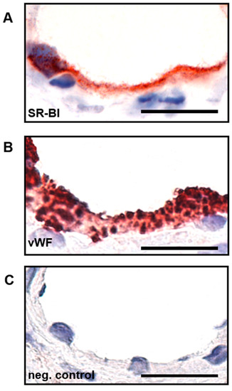 Antibodies for ß-Actin, von Willebrand factor (vWF), GAPDH, and PDZK1 were purchased from Abcam (Cambridge, UK). Goat-anti-rabbit and goat-anti-mouse negative control antibodies were obtained from Biorad (Hercules, CA, USA). SR-BI was detected using a sequence specific SR-BI antibody purchased from Abcam (Cambridge, UK). For double-fluorescence immunohistochemistry monoclonal mouse-anti-human Desmin, mouse IgG1, and normal rabbit immunoglobulin fraction were obtained from Dako (Glostrup, Denmark). Goat-anti-mouse CyTM3 and donkey-anti-rabbit CyTM2 were purchased from Jackson Immunoresearch, Dianova (Hamburg, Germany). The polyclonal rabbit-anti-human SR-BI was obtained from Abcam (Cambridge, UK). Primers for SR-BI and the ribosomal protein L30 gene were designed using Primer3 software (http://frodo.wi.mit.edu/ (accessed on 19 October 2012; newer version available https://bioinfo.ut.ee/primer3/)) and were purchased from Ingenetix (Vienna, Austria). All primers were chosen to span exons to avoid the amplification of traces of contaminating genomic DNA.