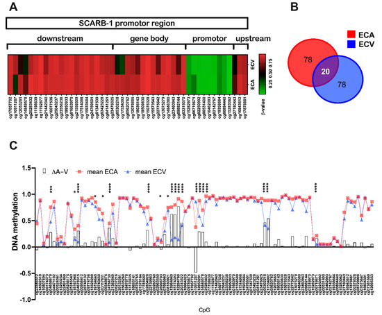 Figure 3. (A) Schematic SCARB1 promoter region structure and related differential CpG methylation pattern between ECA and ECV (n = 9, paired). The heatmap uses β-values as the measure of DNA methylation. A total of 98 CpGs were investigated. (B) Venn diagram representing differentially regulated CpG islets between ECA and ECV. (C) Differentially methylated CpG islets between ECA and ECV; of 98 investigated islets, 20 were significantly different between ECA and ECV. Of these 20, only one CpG islets was hypermethylated in ECV compared to ECA. In the remaining 19 CpGs, methylation was higher in ECA than ECV. In addition to the degrees of methylation (β-values) of ECA (red line) and ECV (blue line), the difference ΔA-V is given as well as white bars. Statistical significance was calculated using M-values instead of β-values, as these are more robust [37]; two-way ANOVA with Sidak’s post hoc test to adjust for multiple comparisons was used, * p < 0.05, *** p < 0.001, **** p < 0.0001.