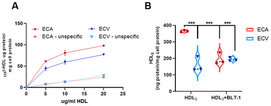 Figure 4. (A) Specific binding of increasing amounts of 125I-labelled HDL to ECA (solid red line) and ECV (solid blue line) at 37 °C was investigated and showed a higher binding of HDL to ECA than ECV. Unspecific binding (dashed lines) at 37 °C in excess of unlabeled HDL is also shown. (B) A total of 10 ug/mL of 3H-labelled HDL3 were offered to ECA and ECV (n = 3) in the presence or absence of the SR-BI inhibitor BLT-1. Selective uptake in ECA was increased compared to ECV, and this increase dropped upon treatment with BLT-1. Nevertheless, a residual selective uptake of HDL occurred in ECA. Two-way ANOVA with Sidak’s post-hoc test for multiple comparisons was used, *** p < 0.001.