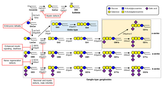 Biosynthetic pathway of gangliosides and sulfatide. GlcCerS catalyzes with the addition of glucose to ceramide, and LacCerS subsequently adds galactose to GlcCer to form LacCer. GalCerS catalyzes with the addition of galactose to ceramide to form GalCer, and CST subsequently adds a sulfate group to form sulfatide SM4. Red rectangles indicate phenotypes observed in mouse KO models. Expression of globo-type GSLs (highlighted by blue rectangle) is elevated substantially in fibroblasts of human GM3S-deficiency patients. In contrast, in GM3S KO-mouse brains and fibroblasts, expression of globo-type GSLs is only slightly elevated, but that of o-series gangliosides (GM1b, GD1α, GD1c: highlighted by yellow rectangle) is elevated substantially (see main text).
