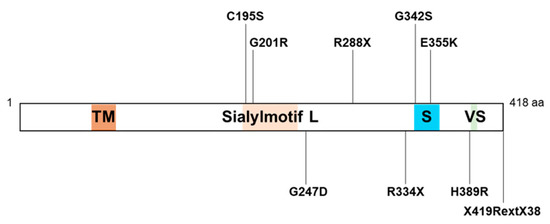 The human GM3S protein consists of 418 amino acids and includes sequences for L- (large), S- (small), and VS- (very small) sialyl motifs (Figure 2), which are highly conserved in mammalian sialyltransferases [60]. A nonsense variant, R288X, detected in numerous Amish GM3S-deficiency patients, two French patients, and three Pakistani patients results in a truncated protein that lacks S and VS. motifs, and was therefore predicted to be nonfunctional [51,53,56]. Plasma GSL analysis of the Amish patients revealed a total absence of GM3 and its downstream derivatives, whereas increased levels were observed for LacCer (the direct substrate of GM3S), o-series gangliosides (e.g., GM1b), and globosides [57]. Several missense variants are located in L or S motifs: E355K (found in African American patients with salt and pepper syndrome), C195S and G201R (found as compound heterozygotes in Korean patients), and G342S (found in an Italian patient). In vitro GM3S assay for LacCer using homogenate of HEK293T cells transfected with mutated ST3GAL5 constructs revealed an absence of enzymatic activity in these variants [58]. A recent study by C. Mignot’s group revealed four more novel variants: missense variants G247D and H389R, nonsense variant R344X, and stop-loss variant X419RextX38, which disrupts the stop codon and causes 37-codon extension of the reading frame [59]. Plasma GSL analysis of patients with these four variants showed significant reduction of GM3 levels; however, GM3 was still present (0.4–2.6 μmol/L in 7 patients, VS 11.5–14.4 μmol/L in 5 controls), as well as residual GM2—which was not observed in Amish patients with the R288X variant. The pathogenic mechanisms of these variants will be clarified by in vitro GM3S assay and analysis of intracellular localization and/or stability of ST3GAL5 protein. Two patients, homozygous for the above stop-loss variant, had the highest plasma GM3 levels (2.6 μmol/L) among the studied patients, and the least severe phenotype [59]. Plasma GM3 levels thus appear to be inversely related to severity of GM3S-deficiency disease.