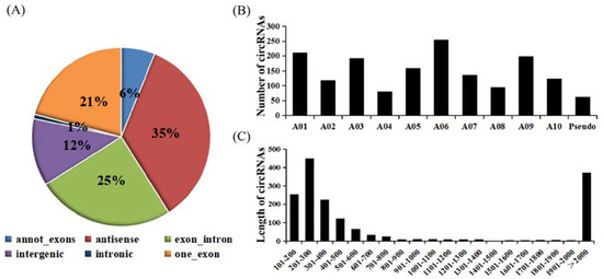 According to genome origination, the 1636 circRNAs were classified into six types, namely annot_exons, one_exon, intronic, exon_intron, intergenic, and antisense, containing 100, 342, 13, 408, 201, and 572 circRNAs, respectively (Figure 1A). The number of circRNAs encoded by the antisense and intronic regions accounted for the most and the least circRNAs (34.9% and 0.7%), respectively. The annot_exons, one_exon, and exon_intron-type circRNAs containing the exon sequence accounted for most of the 1636 circRNAs (approximately 51.96%). These results are consistent with studies in other species, such as Arabidopsis thaliana and Oryza sativa, whose circRNAs originated from exons of a single protein-coding gene, accounting for 50.5% and 85.7%, respectively [37]. The distribution of these circRNAs on chromosomes of B. rapa ranged from 81 to 255 (Figure 1B). For example, 255 circRNAs from chromosome A06 accounted for the most (15.59%), followed by chromosomes A01 and A09. The length distribution of these circRNAs ranged from 101 to 2000 bp. Furthermore, the largest number of circRNAs had lengths ranging from 201 to 300 bp (Figure 1C).