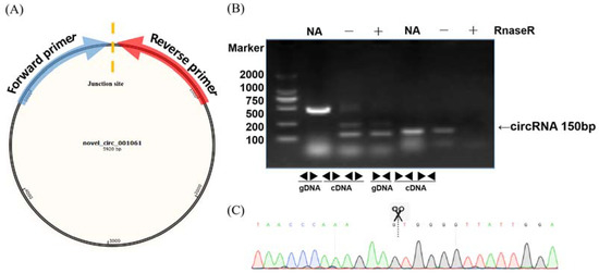 According to the manufacturer’s protocol, the total RNA from all samples was extracted using TRIzol reagent (Invitrogen, Carlsbad, CA, USA). Total RNA was treated with DNase I (Takara Bio, Dalian, China) to remove contaminated genomic DNA. The RNA purity of each sample was determined using a NanoDrop-2000 spectrophotometer (Thermo Fisher Scientific, Wilmington, DE, USA). Samples with a 260/280 ratio of 1.9–2.1 and a 260/230 ratio ≥ 2.0 were considered of high quality and were used for experiments. RNA integrity was verified by 2.0% TAE agarose gel electrophoresis. For RNase R treatment, the total RNA was incubated for 15–30 min at 37 °C with 2 units RNase R per µg total RNA (Lucigen). RNA samples treated with or without RNase R were reverse transcribed with random primers using SuperScript II reverse transcriptase (Takara Bio, Dalian, China).